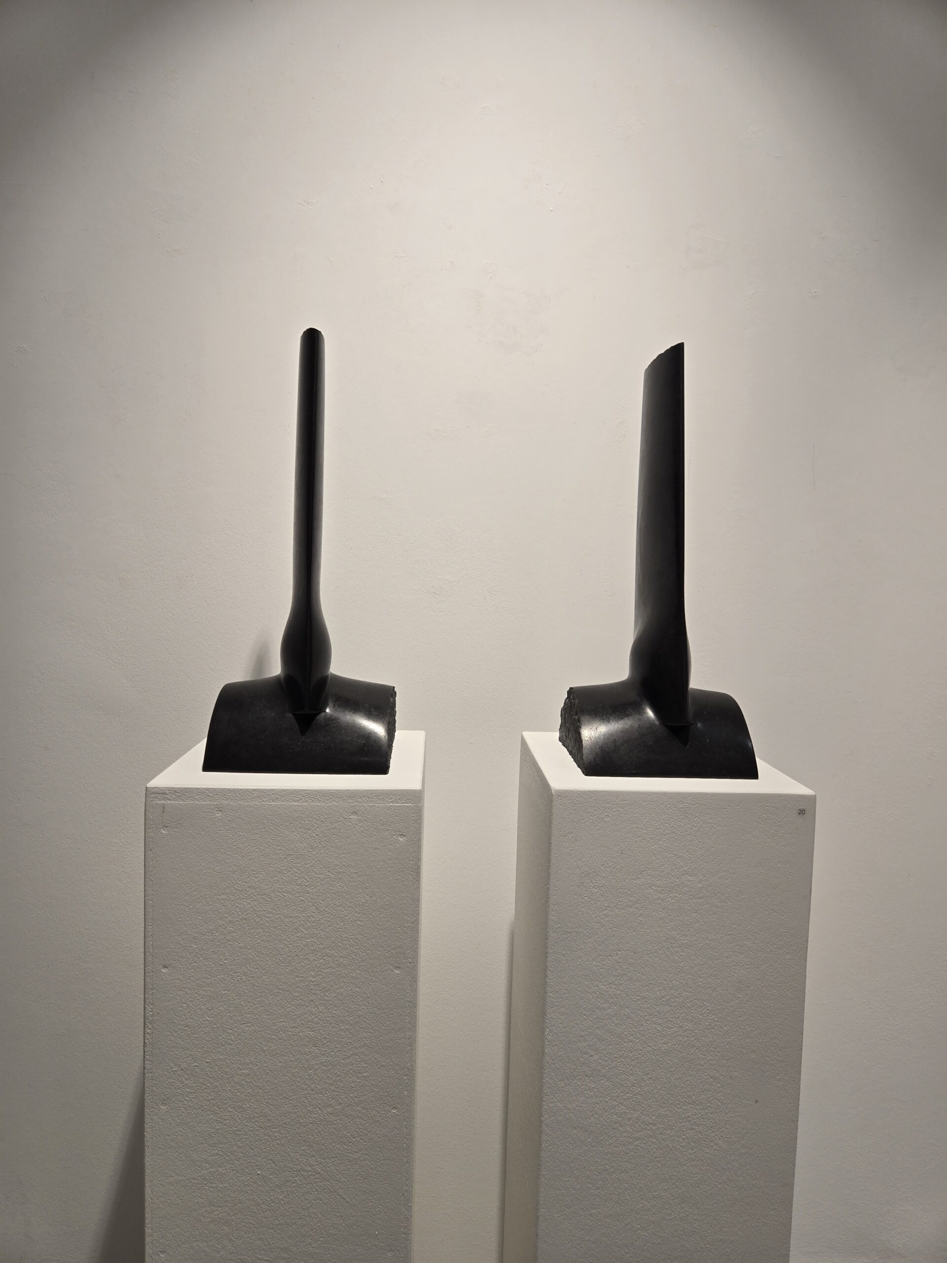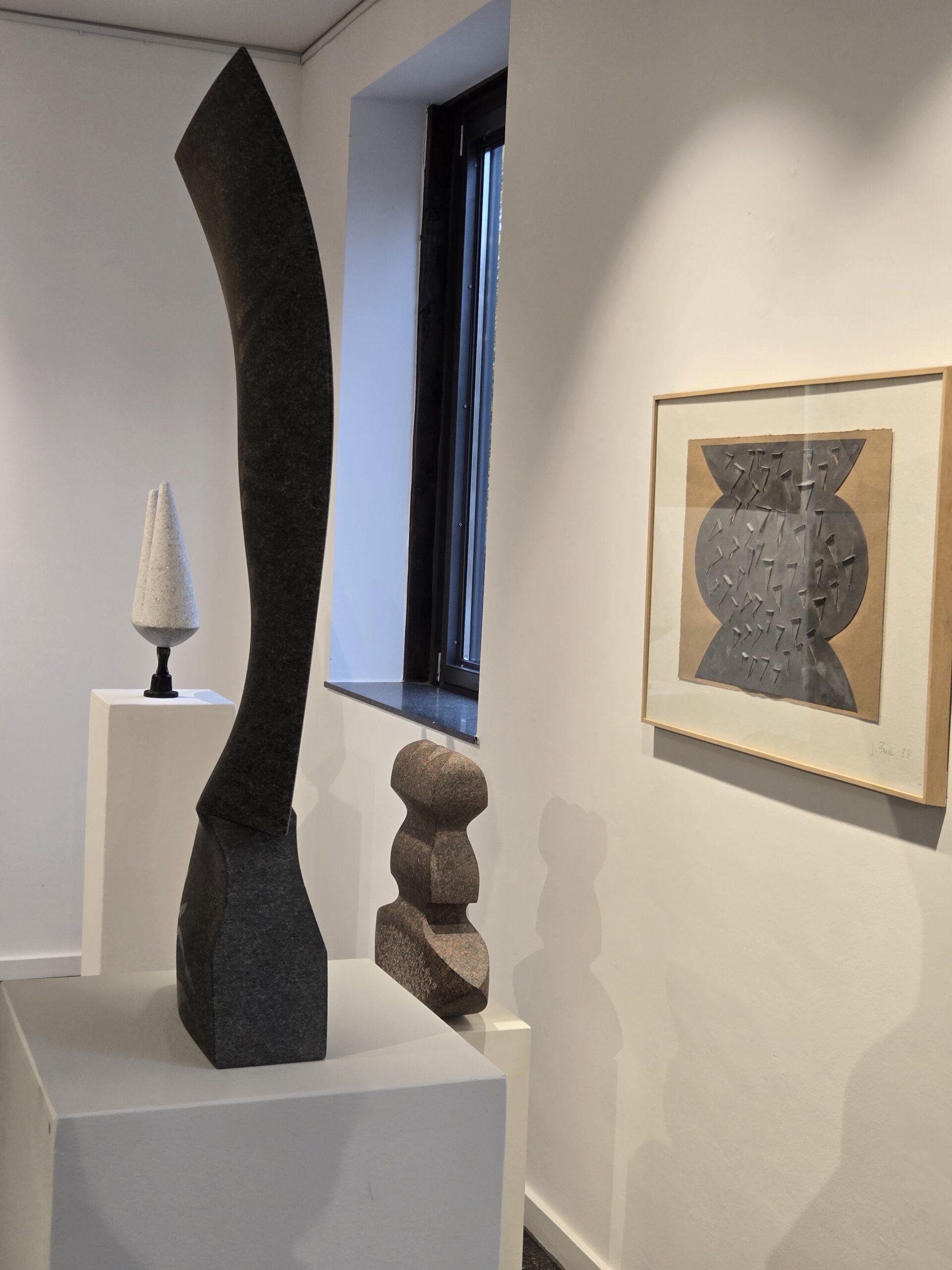 Am Ende ist Jürgen Friede dann doch mehr in der reduzierten, klaren Formsprache als „Zuhause“ angekommen als im realen Afrika mit seinen künstlerischen Traditionen. Darauf mag noch etwas verweisen. Viele Arbeiten tragen zwei Jahresangaben. Nach Jahren, manchmal Jahrzehnten hat Jürgen Friede seine Skulpturen überarbeitet. Jürgen Friede schafft dynamisch, prozesshaft. Er sieht, er setzt um, er korrigiert, er verändert, er stellt auf die Füße, was lag, bis er den Eindruck bekommt: Jetzt stimmt es! Ein Prozess, der sich über Jahre hinziehen kann und an dessen Ende eine Arbeit steht, die in sich schlüssig, klar, perfekt erscheint. Interessant die Veränderungen an den beiden Arbeiten Wächterfigur und Nehir – alles fließt vom Grad in die Ebene, letztere hat dieser Ausstellung den Namen gegeben. Beim Schleifen der Steine fielen Jürgen Friede die Fließspuren des Schleifschlammes auf. Sie hatten eine eigene Schönheit, wie sie sich an dem schwarzen Stein entlangzogen. Ein autopoietisches Element machte die Arbeit perfekt. Jürgen Friede hat die zufälligen nachgearbeitet und so auf Dauer gestellt, fixiert. Und nun entdeckt man je nach Lichteinfall und genauem Blick diese Spuren, die den Stein sehr lebendig werden lassen und dynamisch.